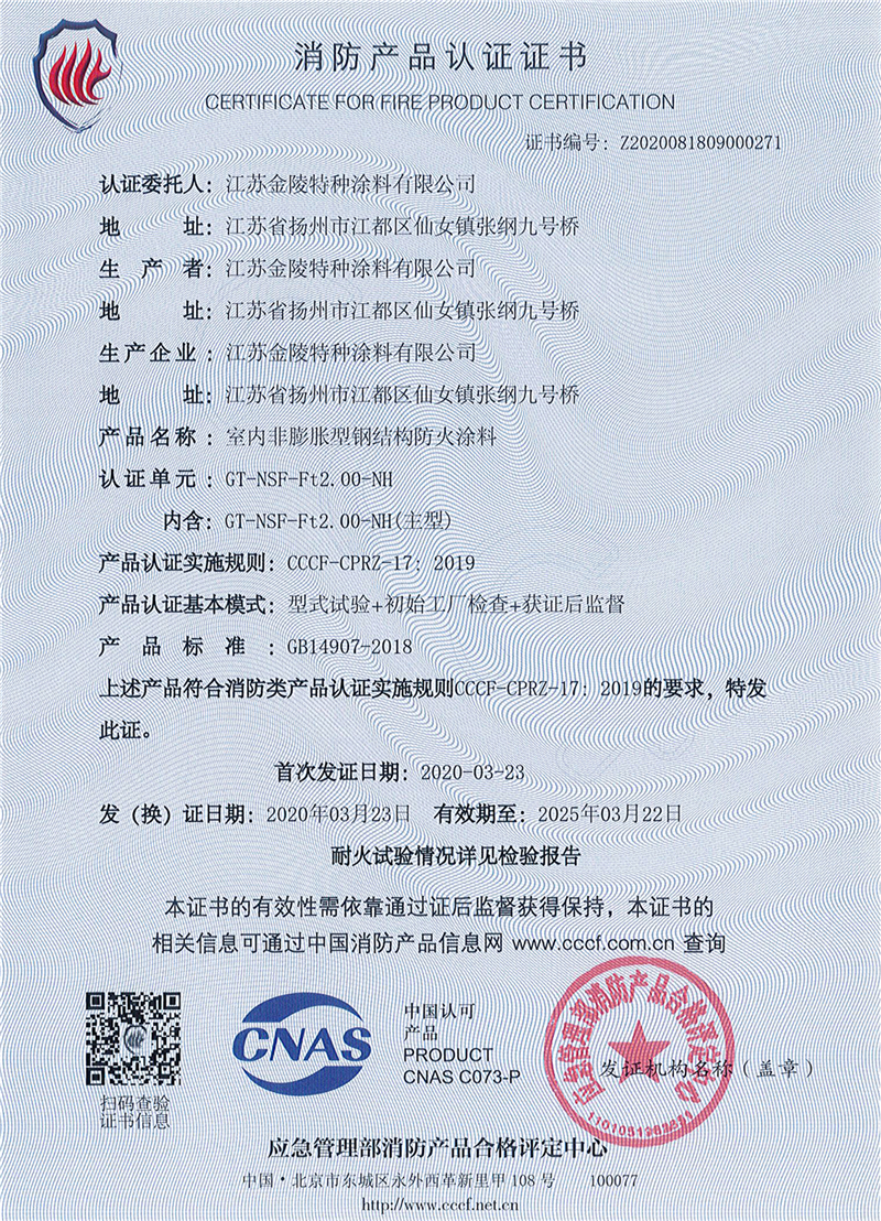 金陵非膨脹型防火涂料利用涂層固有的良好絕熱性,阻止火災熱量向鋼材傳遞,并且在高溫下形成一種結構致密的釉狀物,能有效隔絕氧氣并具有反射熱量作用,延緩鋼結構溫升,起到防火保護作用。